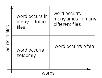 Under the assumption that similar files have similar filenames, meaning use some of the same words in therir filename, the picture should be found in the upper half (generaly speaking). So each point in the lefthand diagram represents a word. Each word belongs to (1..n) files, thier filenames can be displayed as a list. When you select an item (file) in the list, all other words in the diagramm can be marked as occurences of the same word. See demo application |